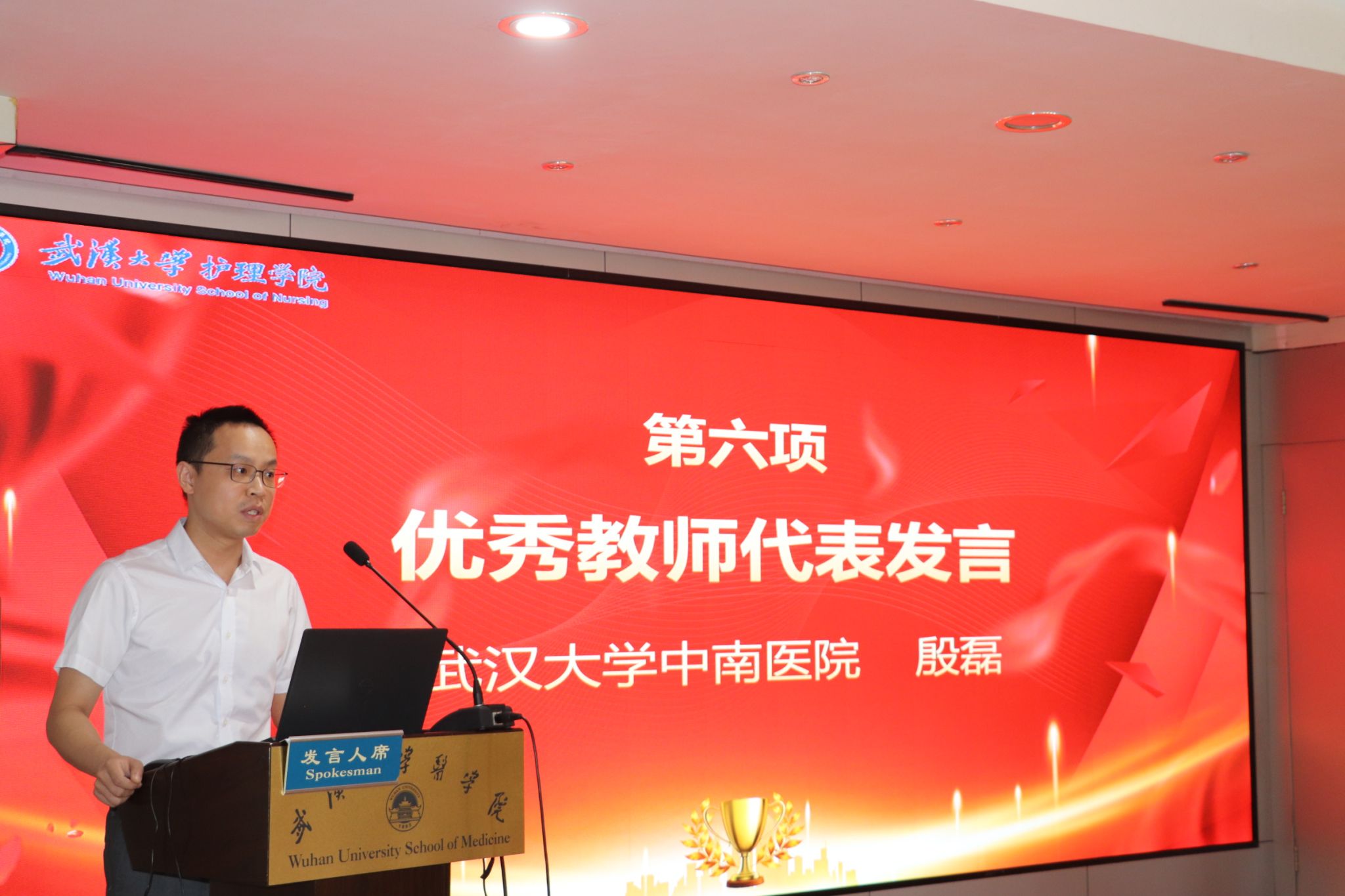中南医院殷磊与优秀学生代表2021级本科生李靖怡发言。两位临床带教老师结合自己切身的带教经历,陈述了自己对师德一词的理解,21级本科生李靖怡代表全体学生向所有教师表示衷心谢意并祝以真挚的节日问候。
