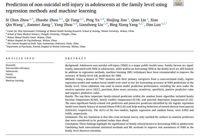 杨冰香课题组在《Journal of Affective Disorders》(中科院二区TOP,JCR一区;IF=6.533)期刊上发表了从家庭层面探索青少年非自杀性自伤风险预测因素的最新研究成果(见图1)。论文题目为“Prediction of non-suicidal self-injury in adolescents at the family level using regression methods and machine learning”。17c