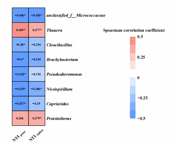 图 2 NTL暴露与新生儿肠道菌群在属水平上的相关性