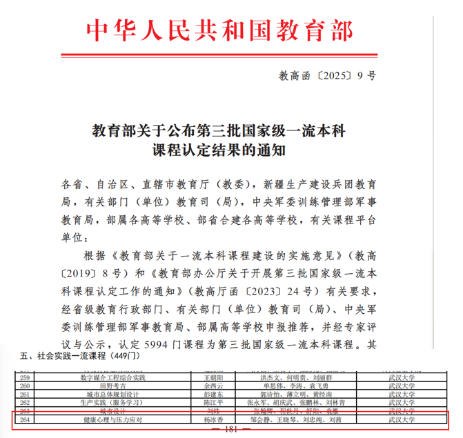 近日,教育部发布《关于公布第三批国家级一流本科课程认定结果的通知》(教高函〔2025〕9号),17c 杨冰香教授负责的《健康心理与压力应对》课程成功认定为国家级一流本科课程(社会实践一流课程),实现17c 在国家级一流本科课程建设方面的新突破。截至目前,学院已获批国家级一流本科课程3门,涵盖线上、线上线下混合及社会实践三种类型,充分体现了学院在课程改革、教学创新和实践育人方面的综合实力。《健康心理与压力应对》...