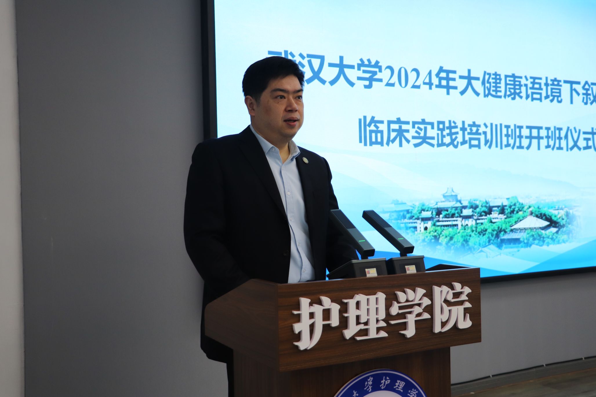 罗睿在开班仪式上致辞,并代表学院对学员们的到来表示热烈欢迎。他简要介绍了校院基本情况,学好叙事护理的重要意义,并希望学员们在学习过程中做好时间管理,确保学习效果;完善学习方法,强化实践运用;培养终身学习的思维和习惯。