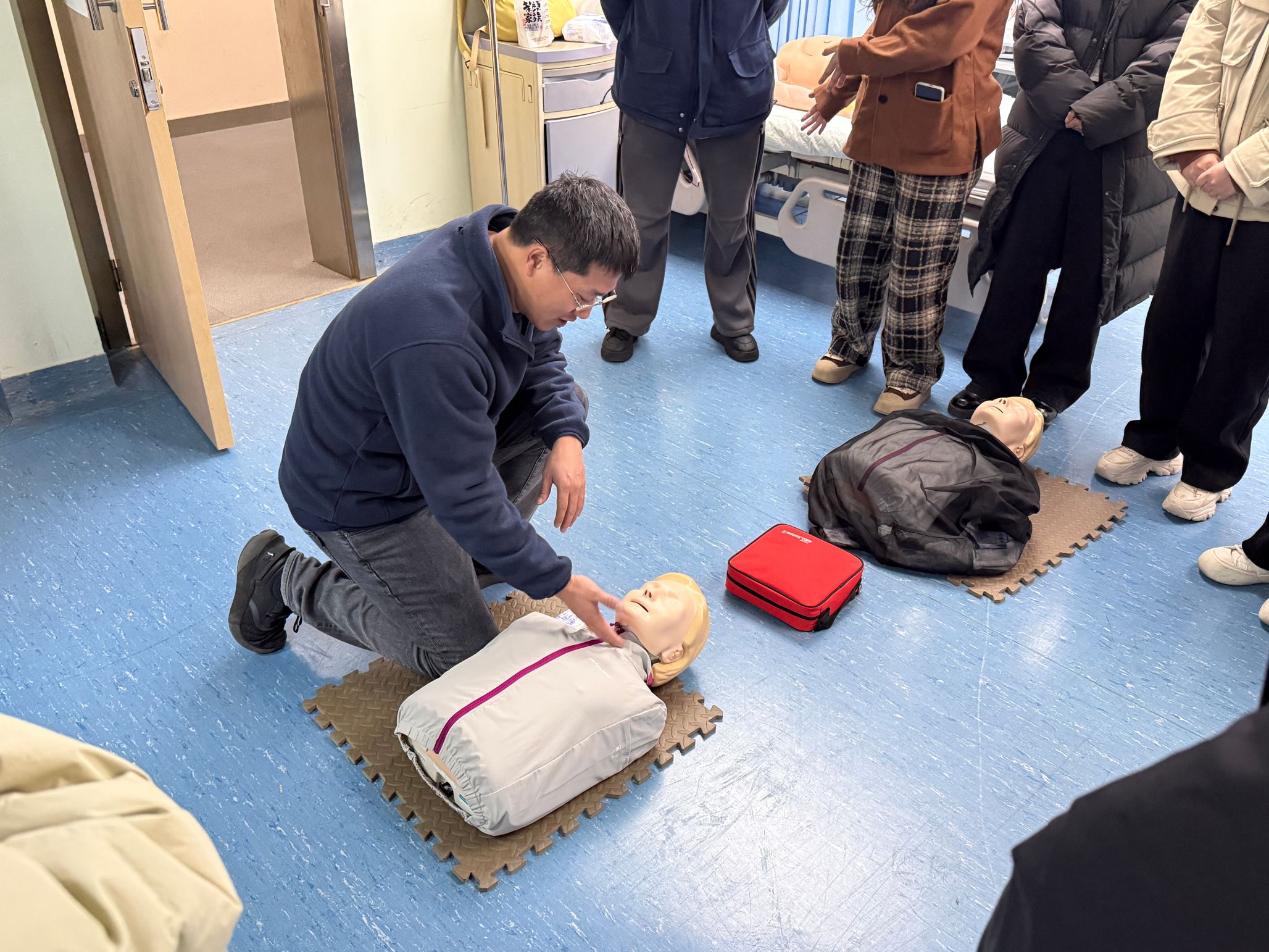 在课程中,张旭通过理论讲解和现场演示,从“黄金4分钟”概念切入,详细阐述了心肺复苏(CPR)的每一个步骤,包括如何判断现场安全性、呼叫求助、实施胸外心脏按压、开放气道与人工呼吸等。他特别指出,在心跳骤停后,争取在4分钟内完成基础心肺复苏是决定患者生还的关键,并通过模拟操作为志愿者们演示了完整流程。为了让大家更直观理解每一个细节,他还就常见误区进行了说明,强调动作标准和操作精准对抢救效果的重要性。