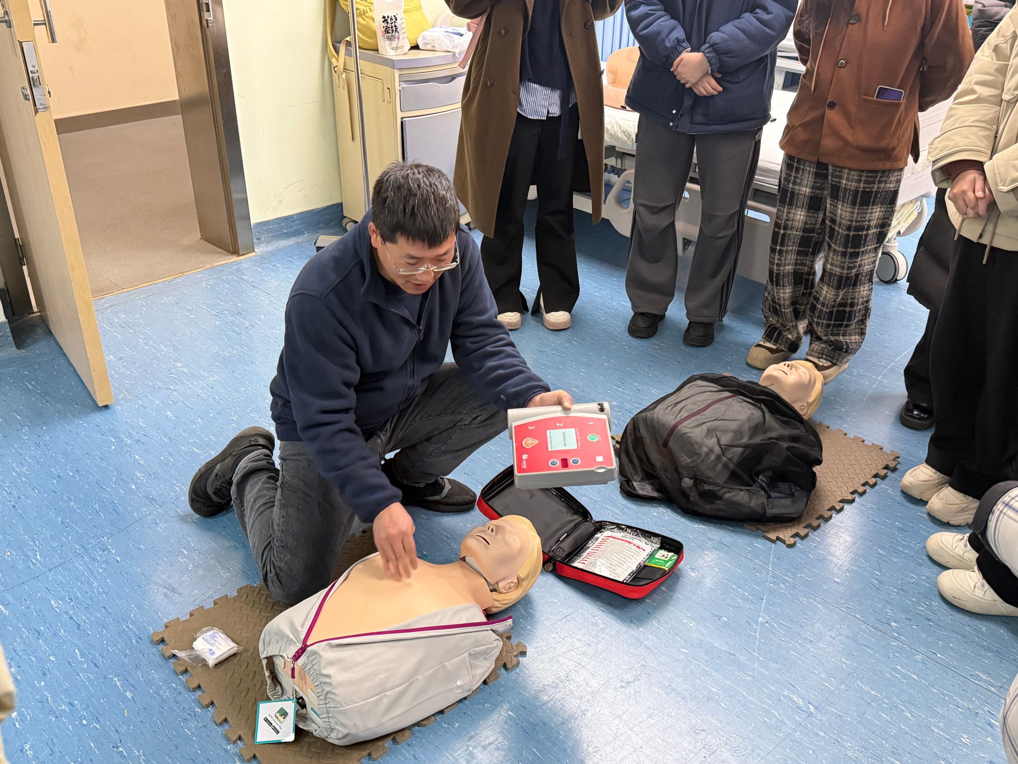 除了心肺复苏,培训还重点讲解了AED(自动体外除颤器)的正确使用。张旭从判断心脏骤停、启动设备到电击操作的全过程进行了详细讲解,并提醒志愿者们如何在紧急情况下快速获取AED设备,确保在第一时间完成救护。通过他生动的示范,志愿者们对AED的使用流程有了清晰的认识。