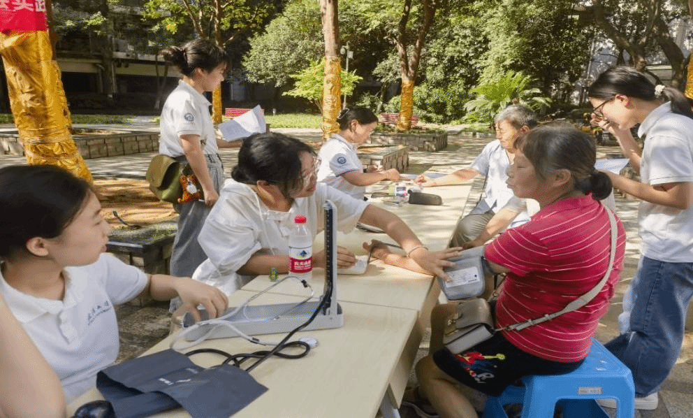 7月11日上午,实践队队员们忙忙碌碌,全心全意为爷爷奶奶们提供帮助,测血糖量血压……可爱的爷爷奶奶们也忙着叫来自己的伙伴们,参与我们的实践活动,我们和爷爷奶奶们打成一片。欢笑声、血压计的播报声、交谈声交织着,谱成了实践活动顺利完成的乐章。