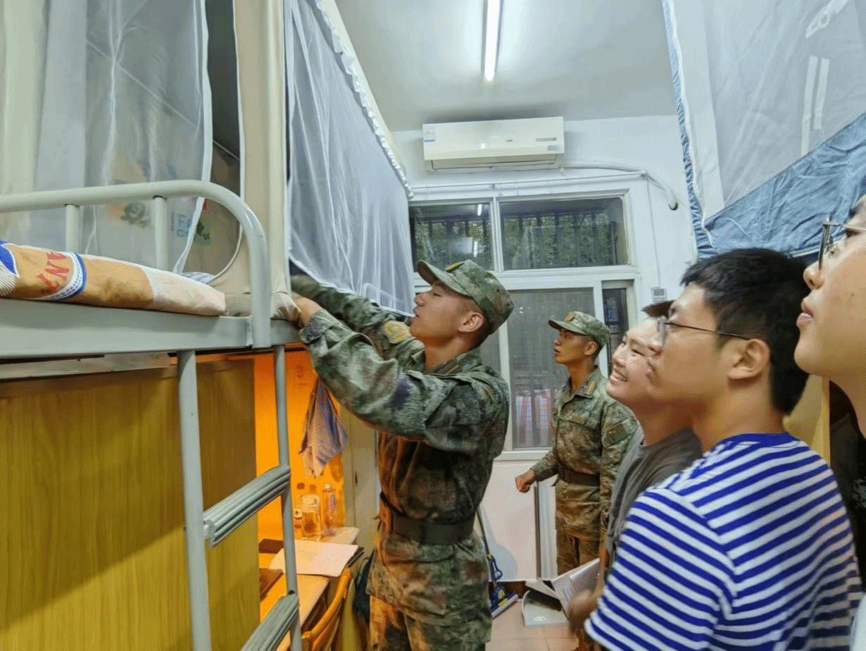 军训场上挺拔的军姿彰显青春风采,军训场下整齐的内务体现自律意识。8月29日傍晚,军训五团教官和各连指导员分别前往新生宿舍,按照规定有序进入各个寝室进行内务示范教学。新生们以楼层为单位前往教学寝室学习参观,并向教官提问内务整理的细节和规范要求。