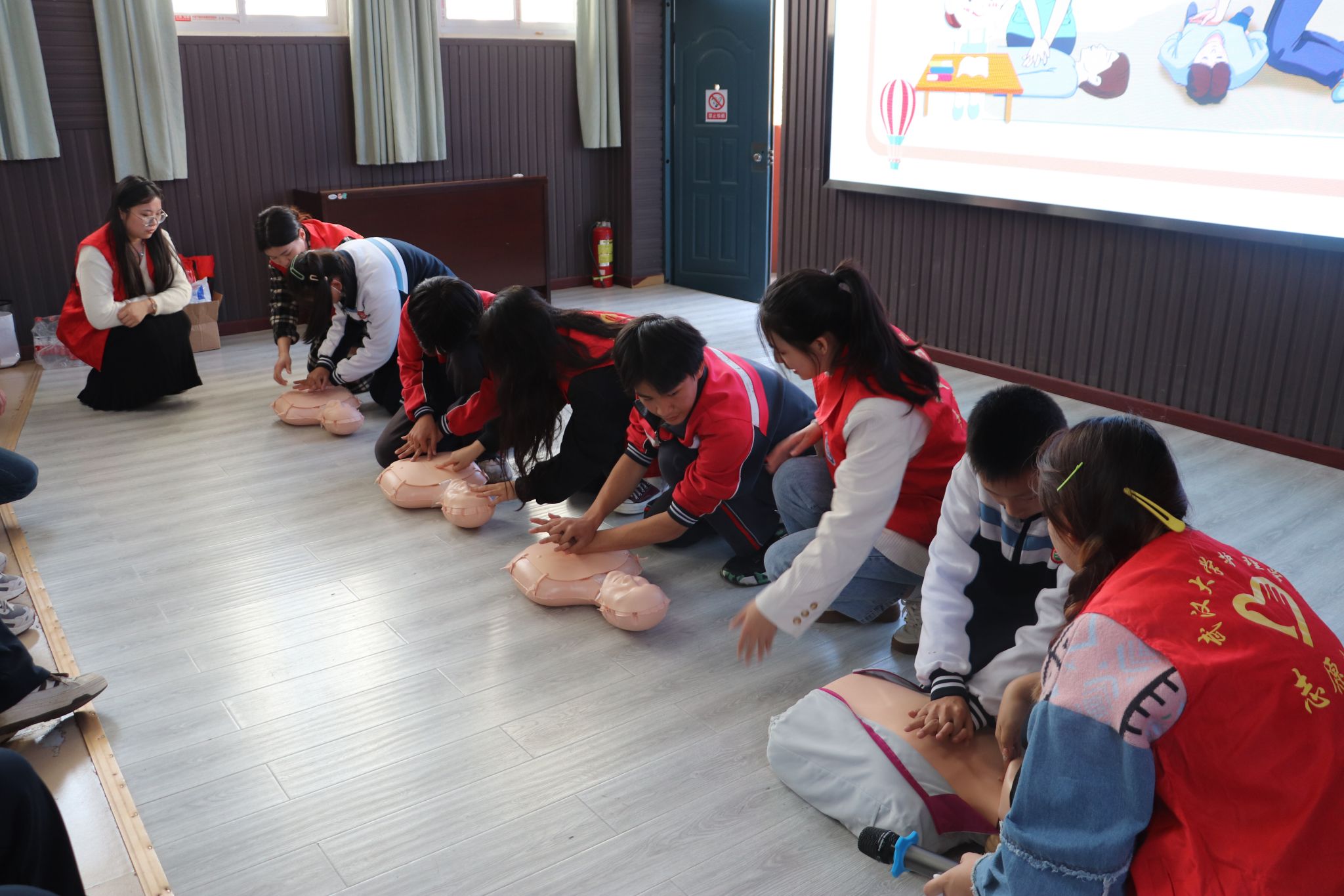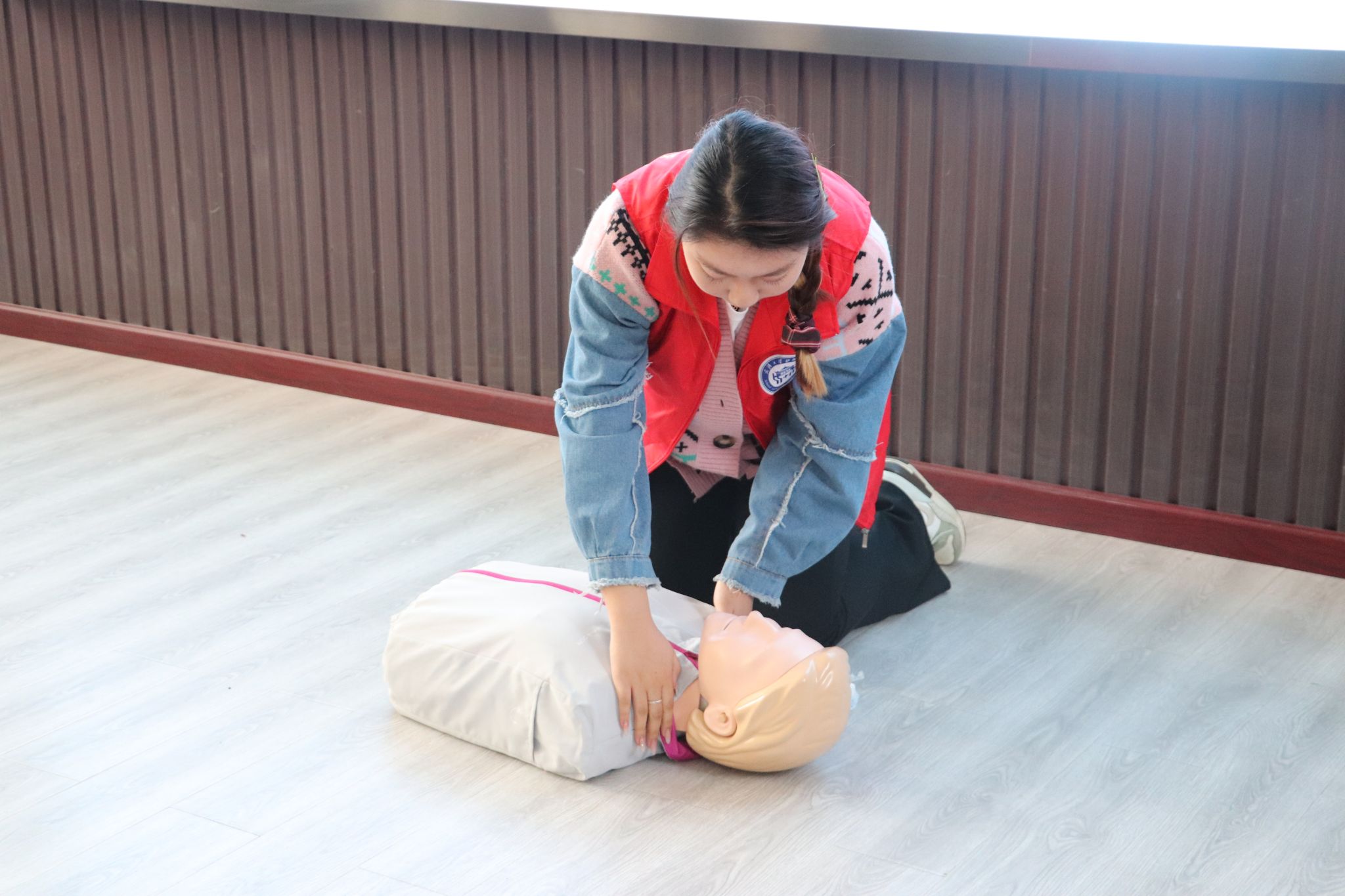 随后,急救知识讲座部分由易曾堂同学主讲,曹馨月同学同步进行演示。讲座主题为“了解心肺复苏”,主讲人们将心肺复苏的步骤及注意事项生动形象地呈现给现场的同学们,激发了他们的好奇心和对急救的敬重之心。讲解结束后,现场邀请了四位同学进行心肺复苏操作的实操体验。在志愿者们的耐心指导下,同学们掌握了心肺复苏术的操作方法,并独立完成了完整的心肺复苏术,他们的脸上洋溢着既辛苦又自豪的笑容。希望此次宣讲能够在他们心中播种下一颗急救的种子,认识到急救的重要性,主动向身边人科普急救知识,为自己及身边人的生命增加一份安全保障。