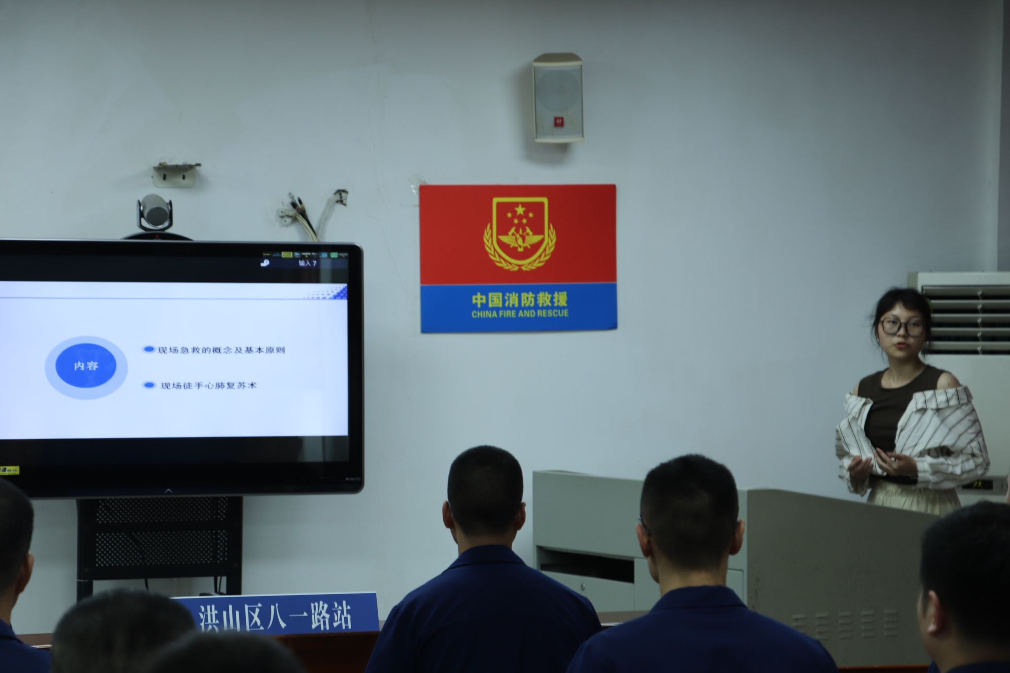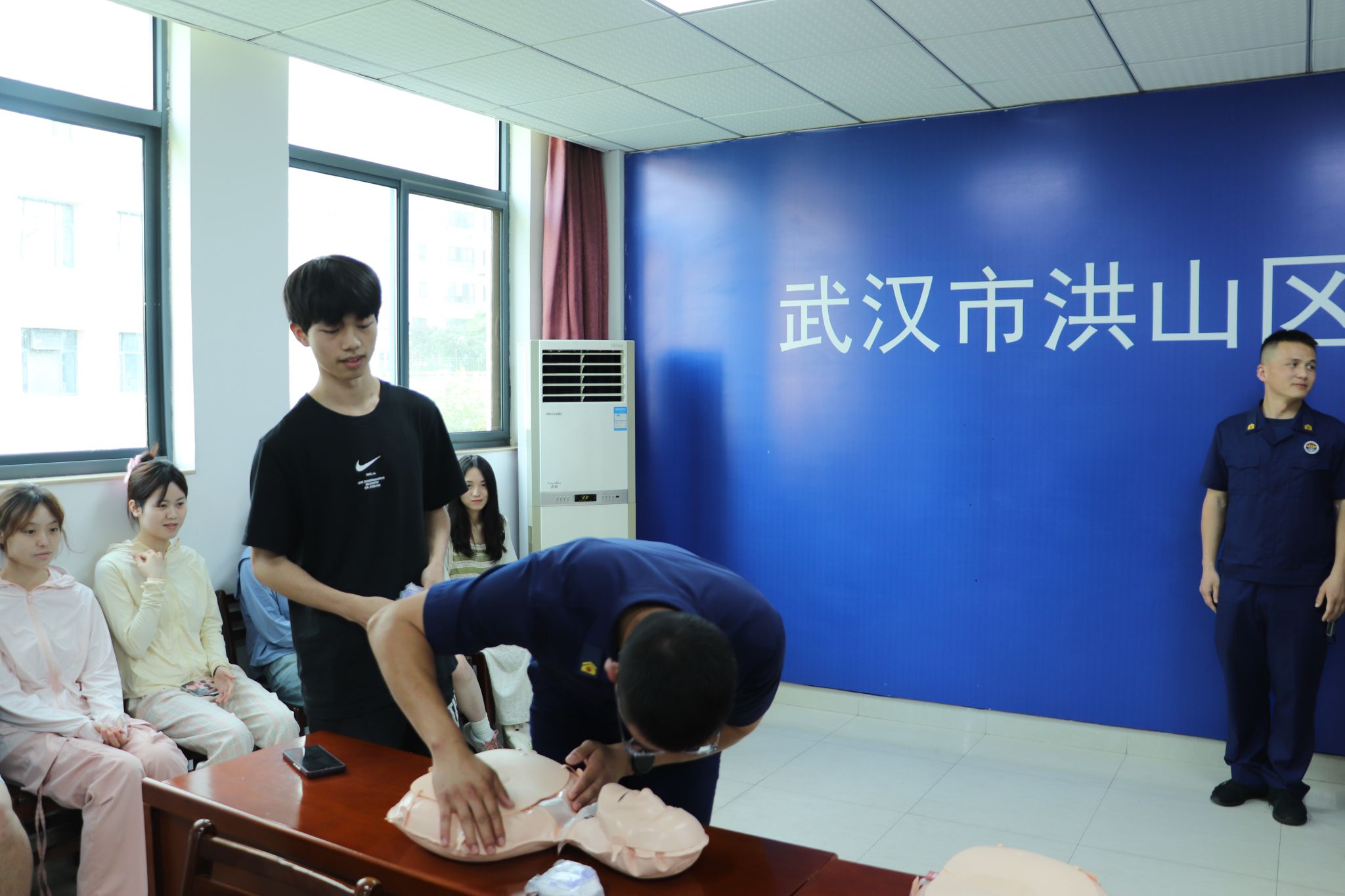 吸收完消防员教授的消防知识后,同学们也发挥专业优势,为消防员们开展了一堂有关心肺复苏(CPR)的模拟实操课。首先,唐姿燕同学详细地介绍了CPR的重要性、操作步骤与注意要点,随后由易曾堂同学为消防员进行CPR实操演习,全方位展示包括判断心脏骤停、正确的按压位置和手法在内的多项关键技能。为了进一步加强消防员对CPR的了解,提升他们的急救能力,同学们还邀请消防员根据所学内容上前进行实操。消防员们纷纷表示学习CPR可以为他们提供更多紧急救援支持。