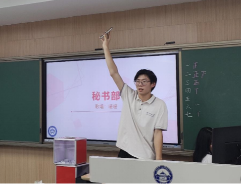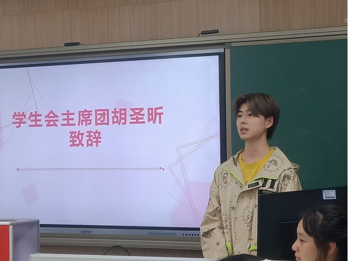 紧接着,由学生会主席胡圣昕进行发言。他表达了对团学新人的热烈欢迎,并预祝此次见面会能够圆满成功。