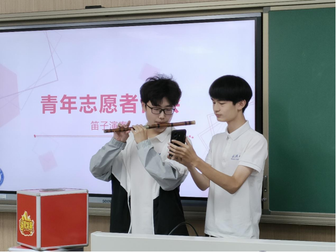 下一个节目由青年志愿协会的潘缘瑞为大家表演了笛子吹奏,笛声可谓清脆悦耳,迷人动听,让人不禁频频称赞呀!报告,捕捉到多才多艺的小伙纸一枚~