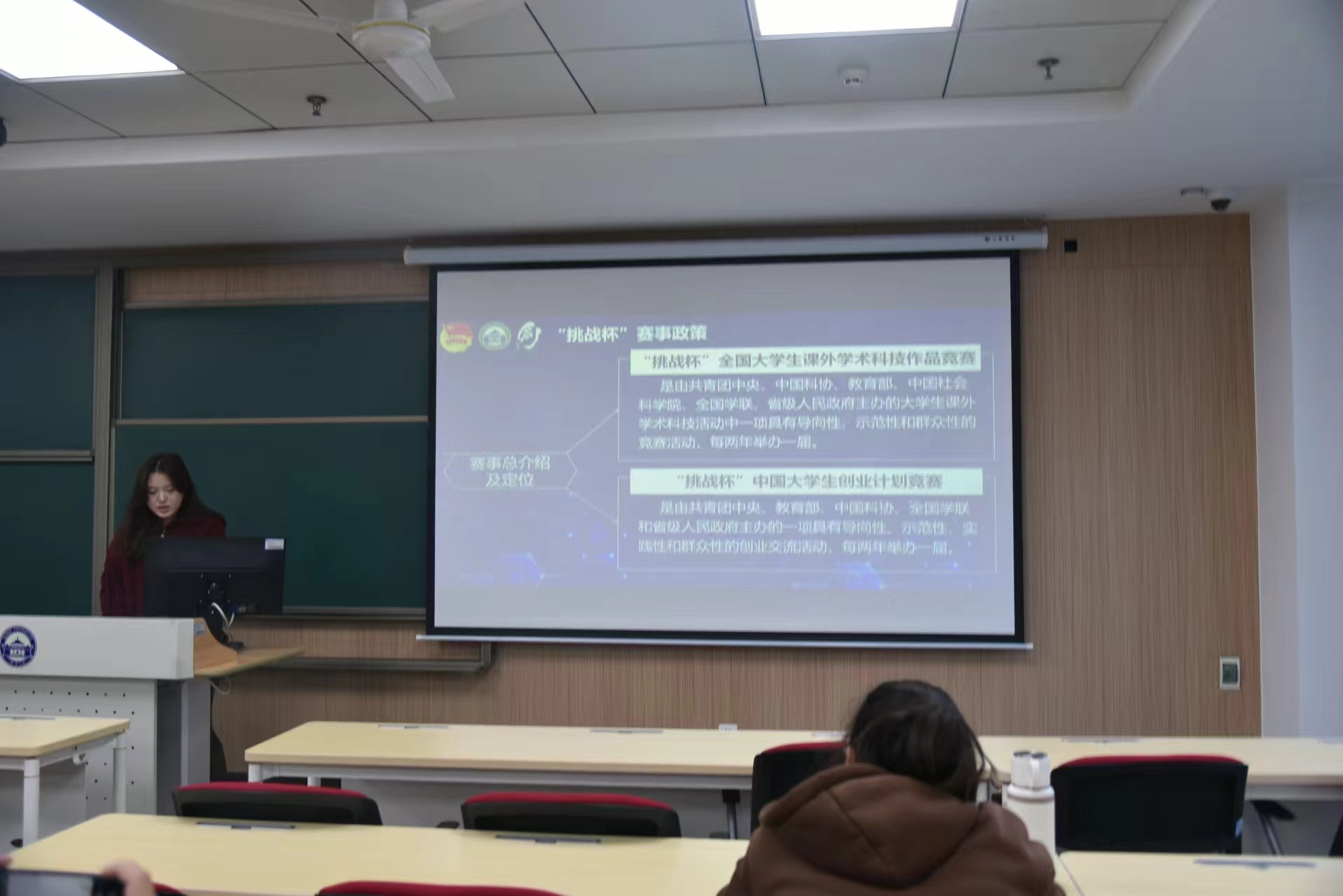随后,刘斯雨同学全方面介绍了“国创赛”的赛事规则与赛事激励政策,指明了不同赛道对参赛者的考察侧重点。代银松同学从规则详解、备赛要点、信息获取途径等方面为同学详细讲解了“挑战杯”赛事内容。