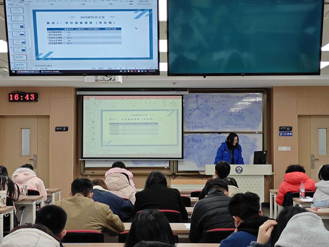 组织全体本科生分年级开展主题班会。新学期班会围绕安全教育、学风建设、学分核查与选课指导四大板块展开,辅导员和班主任老师全程参与,为学生提供全方位的支持与指导。