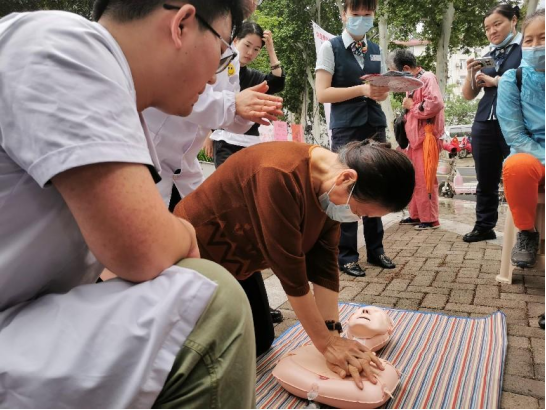 另外,为提高心源性猝死的抢救成功率以及老年人猝死急救能力,实践团队开展了“心肺复苏急救小课堂”。社区居民们展现出了足够的热情,为了保证足够多的居民掌握心肺复苏急救知识,志愿者们连续进行了三次现场宣讲。团队成员首先向居民介绍了心脏除颤器的使用方法。进而对社区居民进行了心肺复苏急救技术(CPR)的实践指导,并且邀请居民亲自实施,志愿者在旁进行指导,使居民能够更加深刻的理解和掌握心肺复苏急救技术(CPR)。一位居民分享到“这个急救操作非常有意义,我们知道了怎么救人,对自己对他人都非常重要。这种活动要经常开展。”