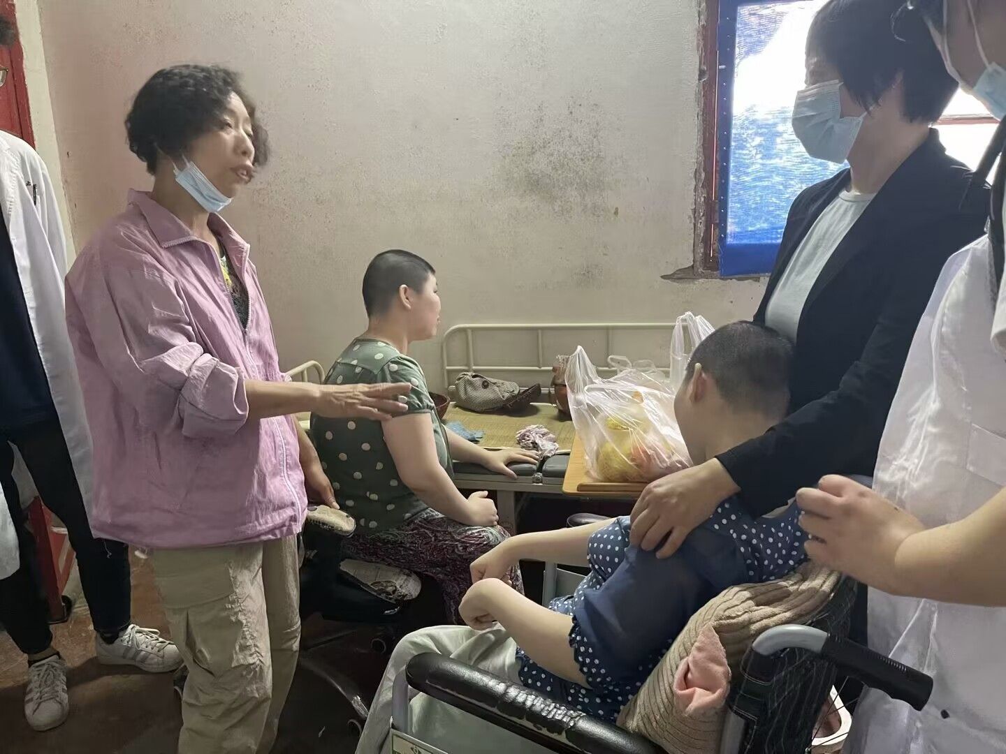 这对双胞胎姐妹李佳欣、李佳丽是先天智力残疾及肢体二级残疾患者,二人无法独立生活,日常坐在轮椅上,平日由慈善和蔼的单亲母亲照护。姐姐李佳欣相比妹妹状态要稍好一些,她情绪比较稳定,能够理解旁边人所说的话,而妹妹李佳丽则情绪有些暴躁,说话含糊不清,思路混乱。