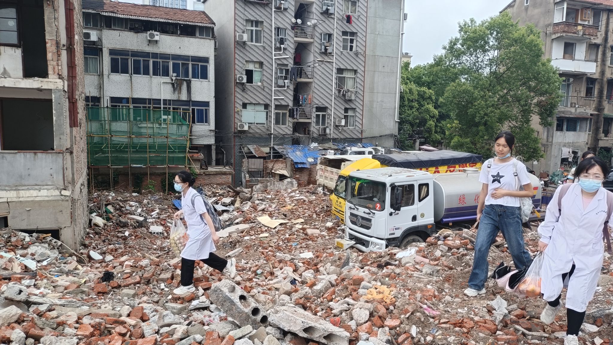 母女三人住在一个极其破旧的拆迁小区,小区门口废墟环绕,小区内部脏乱不堪。去往双胞胎家庭的道路碎石堆积、曲折困难,崩塌的混凝土块、瓦片和梁柱,散落在各个角落;小巷子里随处可见年久失修,狭窄难行的楼梯;无人清理的垃圾被随意地堆砌在街道旁……一路所见所闻让同学们唏嘘不已,难以相信在发达的城市中心竟存在着这样一处破败的居所,而双胞胎家庭就居住在其中一栋高耸陈旧的独栋楼里。