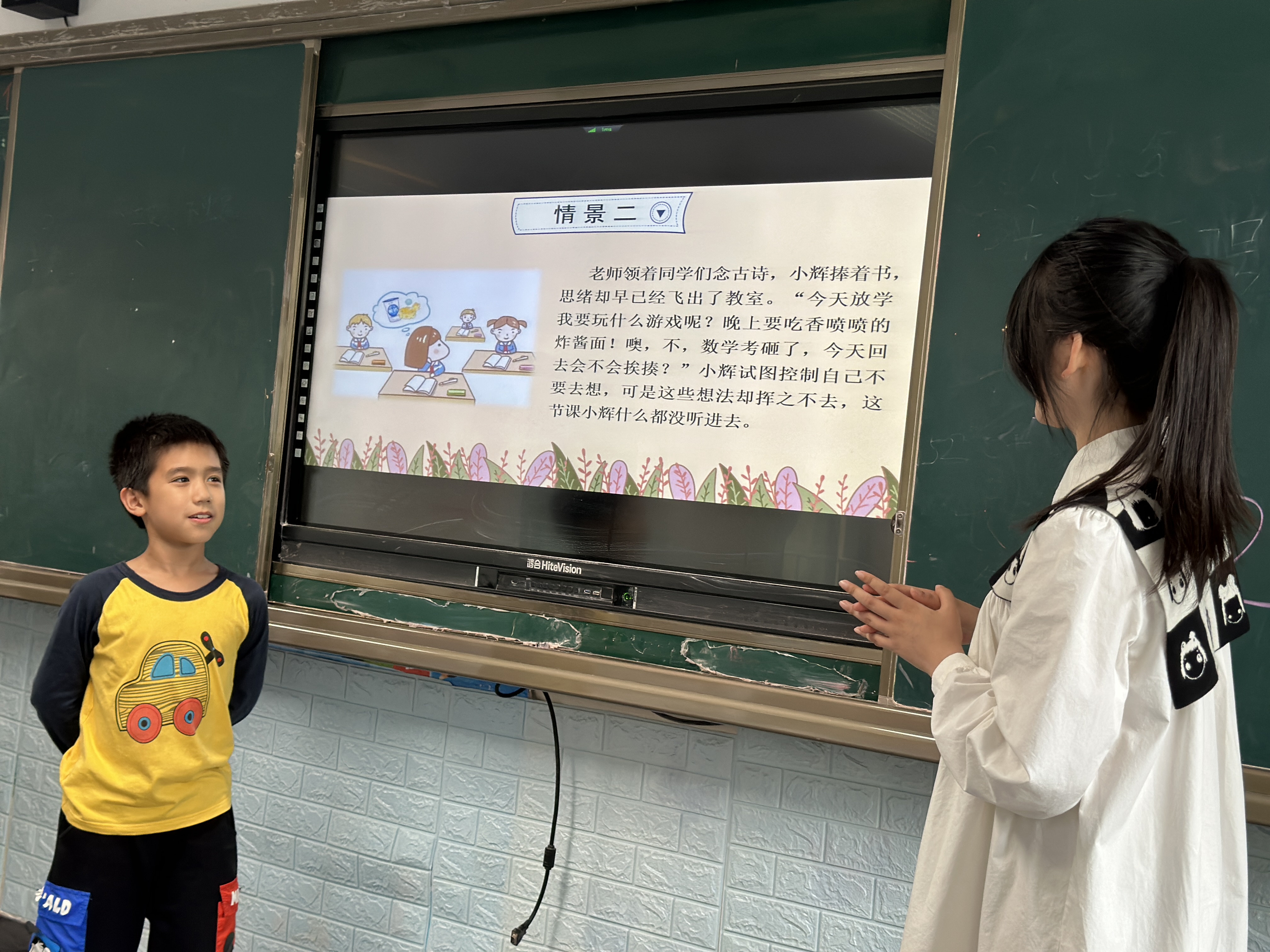 而针对学习时分心的情况,实践队通过邀请同学进行角色扮演的形式,模拟上课、写作业时注意力分散导致走神的情景,和三(4)班的同学们共同探讨遇到这种情况时重新专注的方法,总结出一套应对流程,分享给同学们。