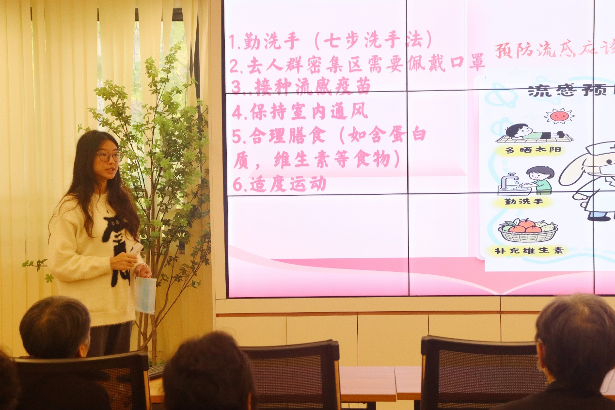 随后,志愿者们开展了一场精心准备的“秋季流感预防和常见疾病知识科普”的讲座。首先,志愿者结合生动的图文展示,用通俗易懂的语言,为在场的老年居民细致讲解了流感的传播特点、常见症状以及关键的预防措施。志愿者们强调,除了及时接种疫苗外,日常生活中的科学防护同样至关重要。讲解志愿者走到老人中间,亲自示范专业的“七步洗手法”,“内、外、夹、弓、大、立、腕”的口诀,配合志愿者们耐心的指导,让在场的爷爷奶奶们很快掌握了这项简单却有效的防病技能。现场学习氛围浓厚,欢声笑语不断。