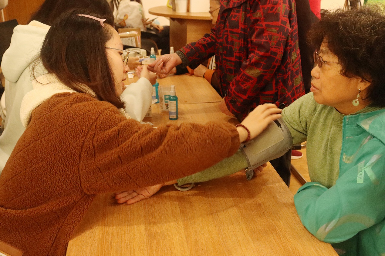 上午八点半,志愿者们已经布置好了检测区域,耐心引导前来参与的老人有序就座。血压测量区,同学们细心为老人卷起衣袖,调整袖带位置,一边测量一边轻声询问日常身体状况。“阿姨,您的血压稍微偏高,平时注意吃得清淡些,早晨散步别太急。”一句句叮嘱中,融入了志愿者们对老人健康的深切关怀。