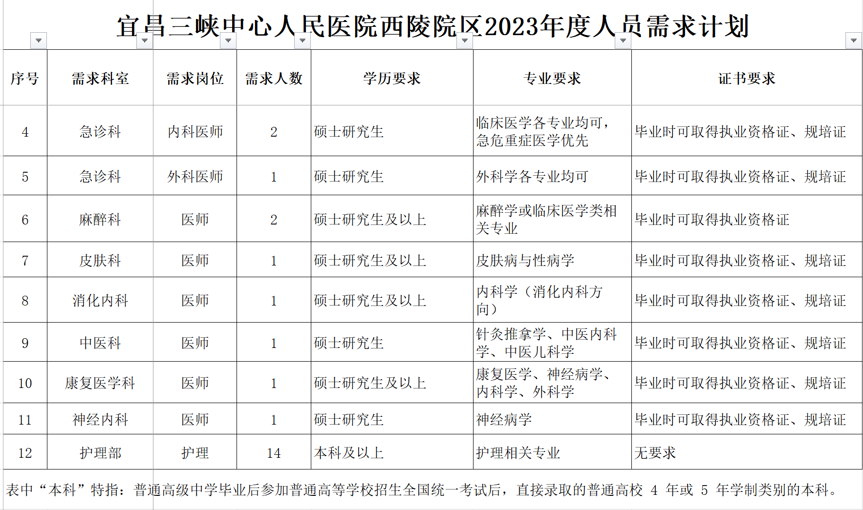 详见《宜昌三峡中心人民医院西陵院区2023年度人员需求计划》(附件一)。