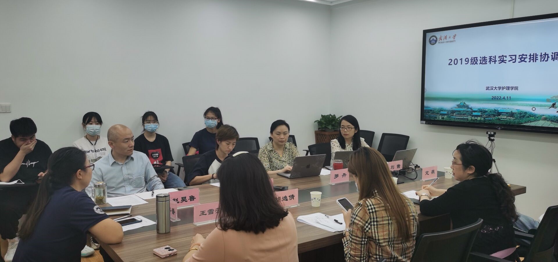 人民医院护理部副主任王雪芬、中南医院护理部副主任张春华、人民医院临床带教负责人胡逸倩、中南医院临床带教负责人定薇、《选科实习》课程负责人刘茜、班级导师罗丹以及4位学生代表参与了此次选科实习安排协调会,会议由刘茜主持。