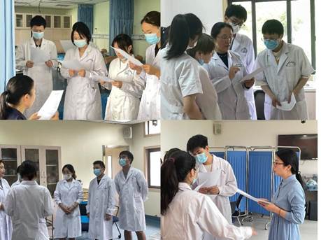 本次综合模拟实训I期末多站式考核共设4个站点:呼吸内科、精神科、肛肠外科和骨科,每站25分钟。学生5人一组,共8个小组,依次按照分组安排轮转各个站点。站点考核流程分为4部分:(1)多站式考核开始指令发放,各个小组统一进入站点,站点老师介绍案例背景和环境(5分钟);(2)小组学生抽签决定各自角色—情景模拟或书面答题,然后5人集体讨论情景,准备用物(10分钟);(3)情景模拟考试开始指令发放,各站点统一进行站点案例考核,限时10分钟;(4)考核结束指令发放,各小组有序离开,前往下一个站点准备区等候多站式考核开始指令发放。