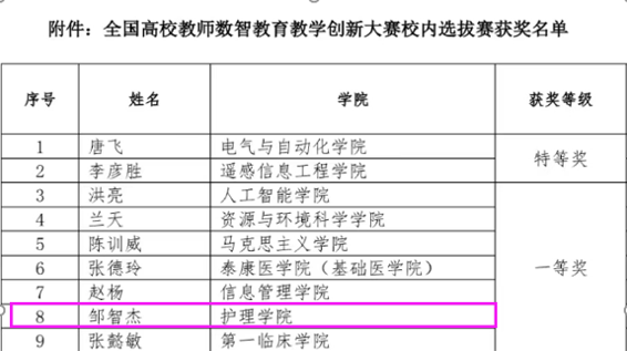 同时,邹智杰老师个人在“全国高校教师数智教育教学创新大赛校内选拔赛”中脱颖而出,荣获一等奖。以《护理学基础》课程为载体,围绕“虚实融合、数据赋能”的理念,创新设计护理人才培养新模式,充分展现了新时代护理教育对数智化发展的深度回应与有力实践。