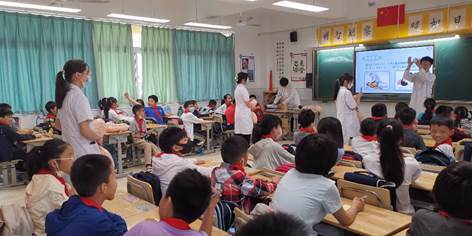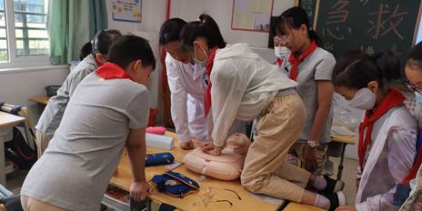 2020级全体学生在余立平、孟宪梅、喻惠丹老师的带领下来到湖北省武昌实验小学(东湖国际校区),并在国旗下讲话,介绍了心肺复苏进校园的重要性。并在随后的第一节课分成六组进班教学,两周共计完成了三、四两个年级550人的培训。通过这次活动,让孩子们掌握了急救知识、急救技能,根植了“见义智为”的意识,这不仅是一节通识课,更是一节鲜活的思政课。课程的知识目标、能力目标和价值目标完全体现。