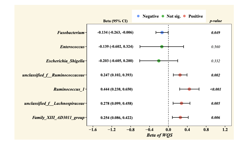 因此本课题组基于已建立的母婴队列开展了不同粒径的颗粒物暴露对幼儿肠道菌群的影响研究。利用国家遥感科学重点实验室研究小组开发的Space-Time Extra-Trees(STET)模型,根据研究对象居住地址估计其住址水平的PM1,PM2.5和PM10暴露情况,使用多污染物模型进行混合颗粒物对肠道菌群的回归分析。研究结果发现混合颗粒物暴露与幼儿肠道菌群的α多样性呈正相关,在不同的模型内颗粒物的权重占比有所差异(图1)。混合颗粒物暴露与幼儿肠道菌群Fusobacterium菌属呈负相关,与unclassified_f__Ruminococcac、Ruminococcus_1、unclassified_f__Lachnospiraceae 以及Family_XIII_AD3011_group菌属呈负相关(图2)。在颗粒物暴露对幼儿肠道菌群属水平的效应中,不同颗粒物的权重占比在不同滞后时间内存在变化(图3)。这些发现首次提供了不同粒径颗粒物的联合暴露与幼儿肠道菌群之间存在重要关联的证据,为未来从环境风险因素角度进行幼儿的健康管理提供了理论依据。