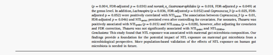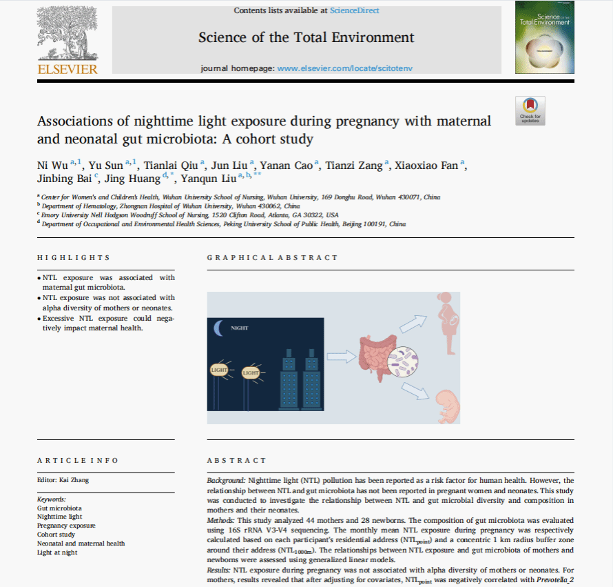刘燕群课题组在环境科学高水平期刊Science of the Total Environment(中科院一区TOP期刊)杂志上发表了题为“Associations of nighttime light exposure during pregnancy with maternal and neonatal gut microbiota: A cohort study”(妊娠期夜间灯光暴露与母婴肠道菌群的联系:一项队列研究)的研究成果。该研究发现妊娠期夜间灯光(Nighttime light,NTL)暴露会显著影响母亲的肠道菌群,并讨论了其潜在的健康风险。研究结果对未来的孕妇健康管理具有重要意义。17c
