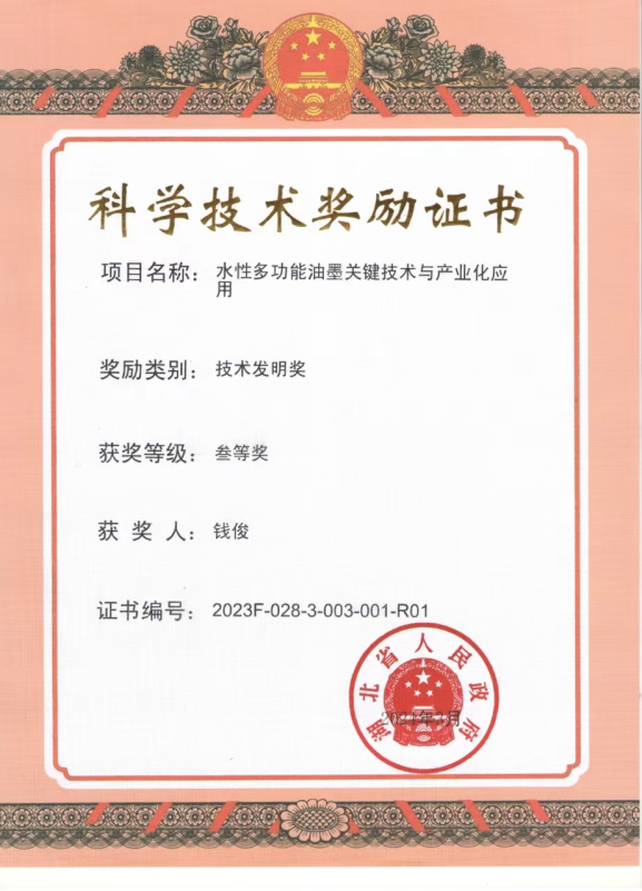 智慧护理工程研究中心钱俊教授团队水性多功能油墨关键技术与产业化应用项目获技术发明奖三等奖。
