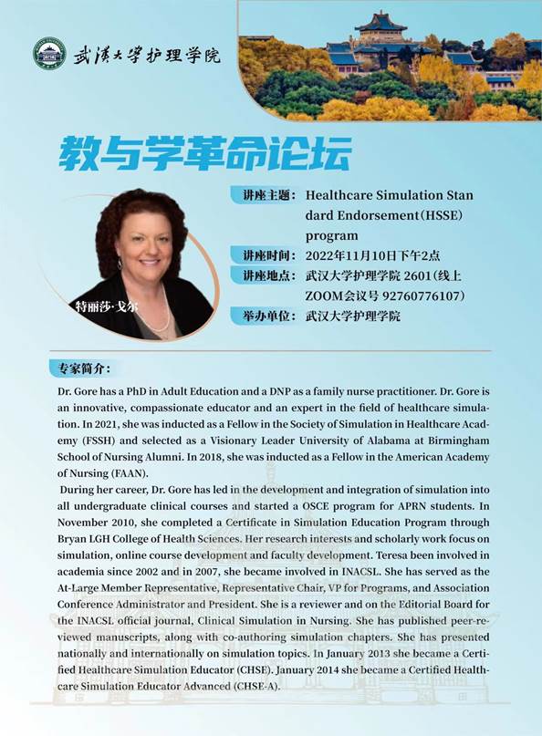 随后Gore教授解读了INACSL(国际护理临床模拟协会,International Nursing Association for Clinical Simulation and Learning ) 的“Healthcare Simulation Standard Endorsement (HSSE,//www.inacsl.org/healthcare-simulation-standards-endorsement)”项目。这一项目旨在为模拟教育中遵循了INACSL的最佳实践标准中的四项核心标准的团队提供认证。Gore教授除为学院教师全面解读这一项目外,还为老师们分享了模拟教学案例设计的框架以及在线可以获取的模拟教学资源。