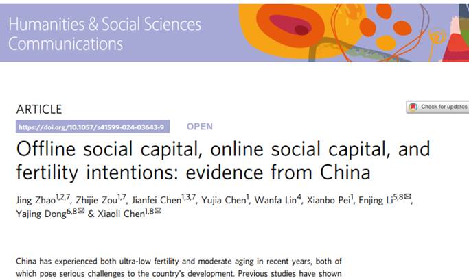 教授陈晓莉课题组的最新科研成果。论文题目为“Offline social capital, online social capital, and fertility intentions: evidence from China”(线上社会资本、线下社会资本与生育意愿:来自中国的证据)。17c