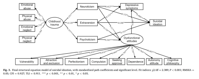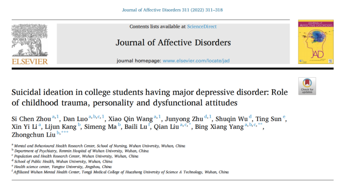 杨冰香课题组在《Journal of Affective Disorders》(中科院二区TOP,JCR一区;IF=6.533)期刊上发表了患有重度抑郁症大学生的儿童期创伤、人格、功能失调性态度和自杀意念之间关系的最新研究成果(见图1)。论文题目为“Suicidal ideation in college students having major depressive disorder: Role of childhood trauma, personality and dysfunctional attitudes”。17c