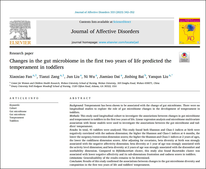 刘燕群课题组在《Journal of Affective Disorders》期刊上发表了关于生命早期前两年肠道菌群变化和幼儿气质之间联系的最新研究进展。该论文题目为“Changes in the gut microbiome in the first two years of life predicted the temperament in toddlers”。17c
