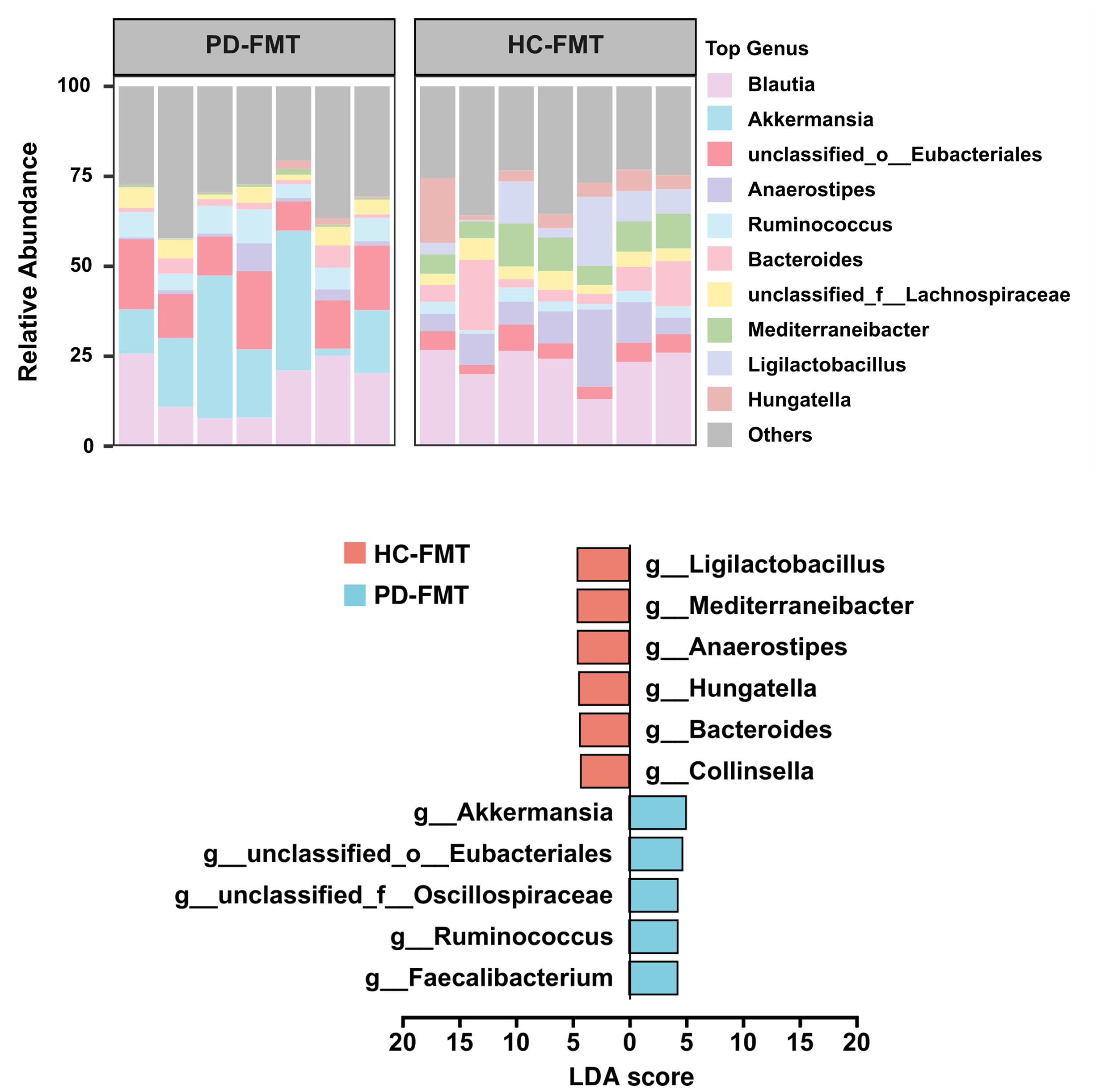 进一步的宏基因组测序与非靶向代谢组学分析发现,这些小鼠的肠道菌群组成与代谢功能发生显著改变,具体表现为:联合乳杆菌(Ligilactobacillus)显著减少,阿克曼氏菌(Akkermansia)明显富集等(图2),且甘油磷脂代谢出现异常(图3)。