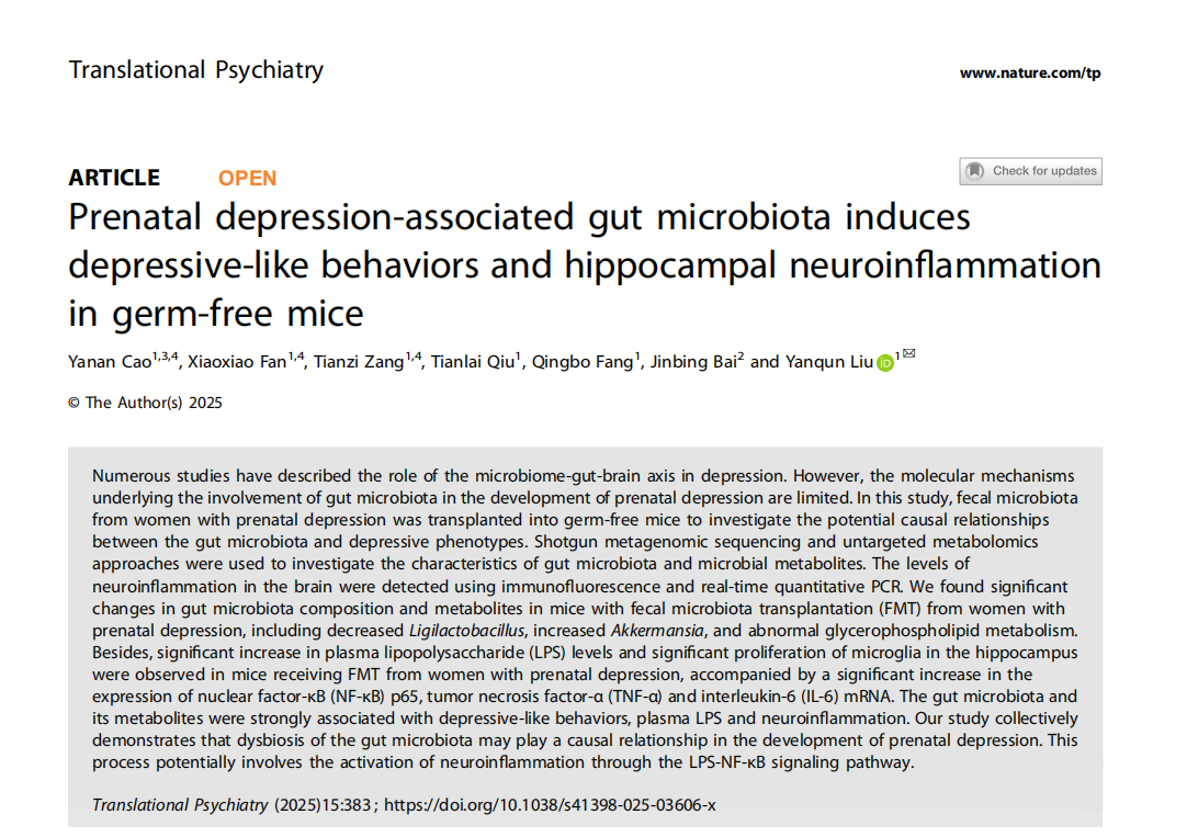 刘燕群课题组在Translational Psychiatry上发表题为“Prenatal depression-associated gut microbiota induces depressive-like behaviors and hippocampal neuroinflammation in germ-free mice”的研究论文。该研究首次通过跨物种粪菌移植实验证实,产前抑郁相关肠道菌群失调能够诱发无菌小鼠的抑郁样行为,具体作用机制为菌群失调改变宿主的代谢功能,使免疫调节失能,激活核因子κB(Nuclear Factor kappa B, NF-κB)信号通路,引起小胶质细胞介导的神经炎症。该发现为肠道菌群失调与产前抑郁之间的因果关系提供了最直接的实验证据。17c