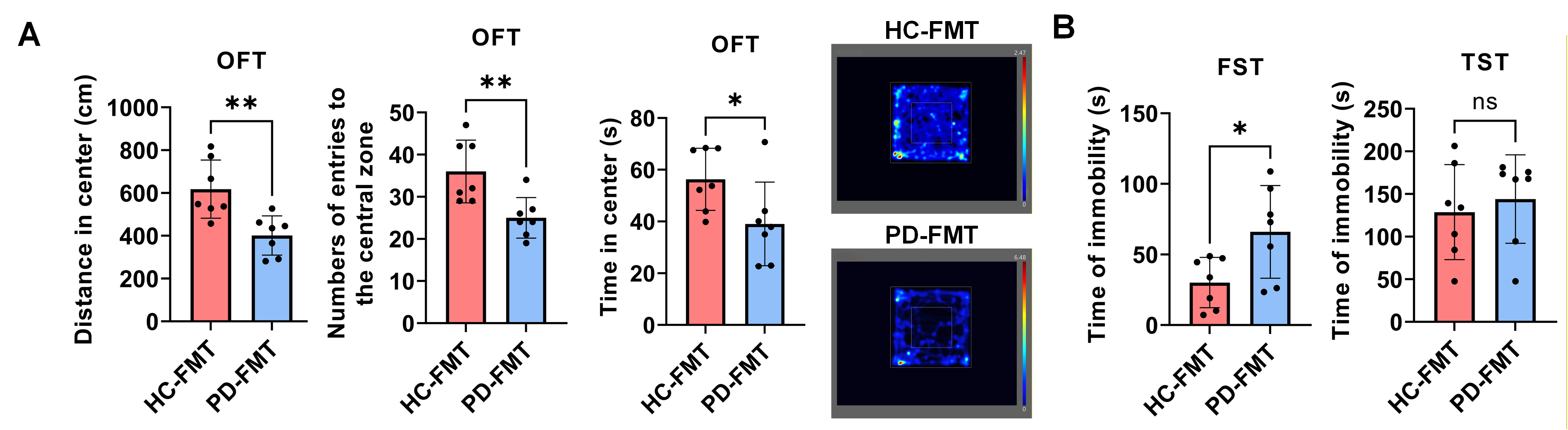 基于此,研究团队从前期队列中随机选取产前抑郁孕妇与健康孕妇的粪便样本,制备粪菌悬浮液,并通过灌胃将其分别移植至无菌小鼠体内。行为学实验结果显示,接受产前抑郁孕妇菌群抑制的小鼠表现出明显的抑郁样行为(图1)。