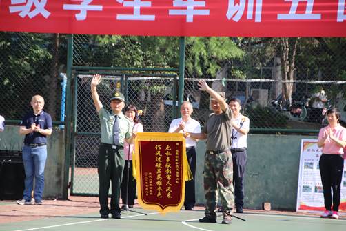 最后,由军训五团政委边志国老师向武昌职业学院火箭军大队方旭东团长赠锦旗。