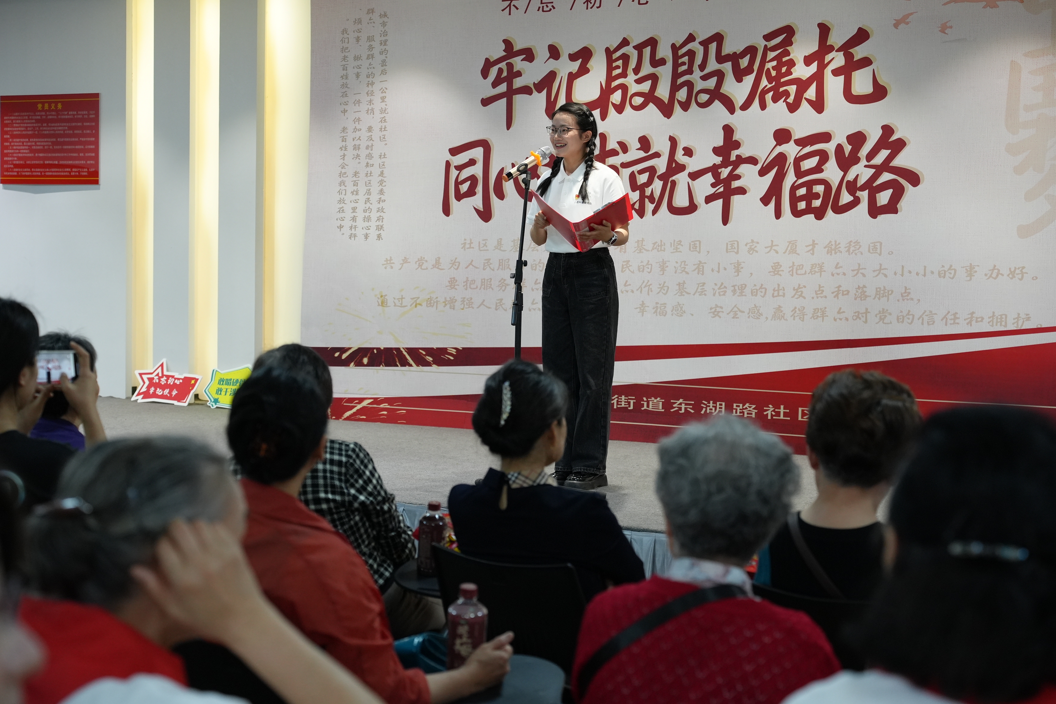 2025年427日,一场主题为《牢记殷殷嘱托,同心铺就幸福路》的党建活动在东湖路社区圆满举行。17c 积极参与社区党建活动,张茜雅同学带来的朗诵节目《青春志愿,为人民服务》,以真挚情感与饱满热情,赢得社区居民的热烈掌声和高度赞赏。