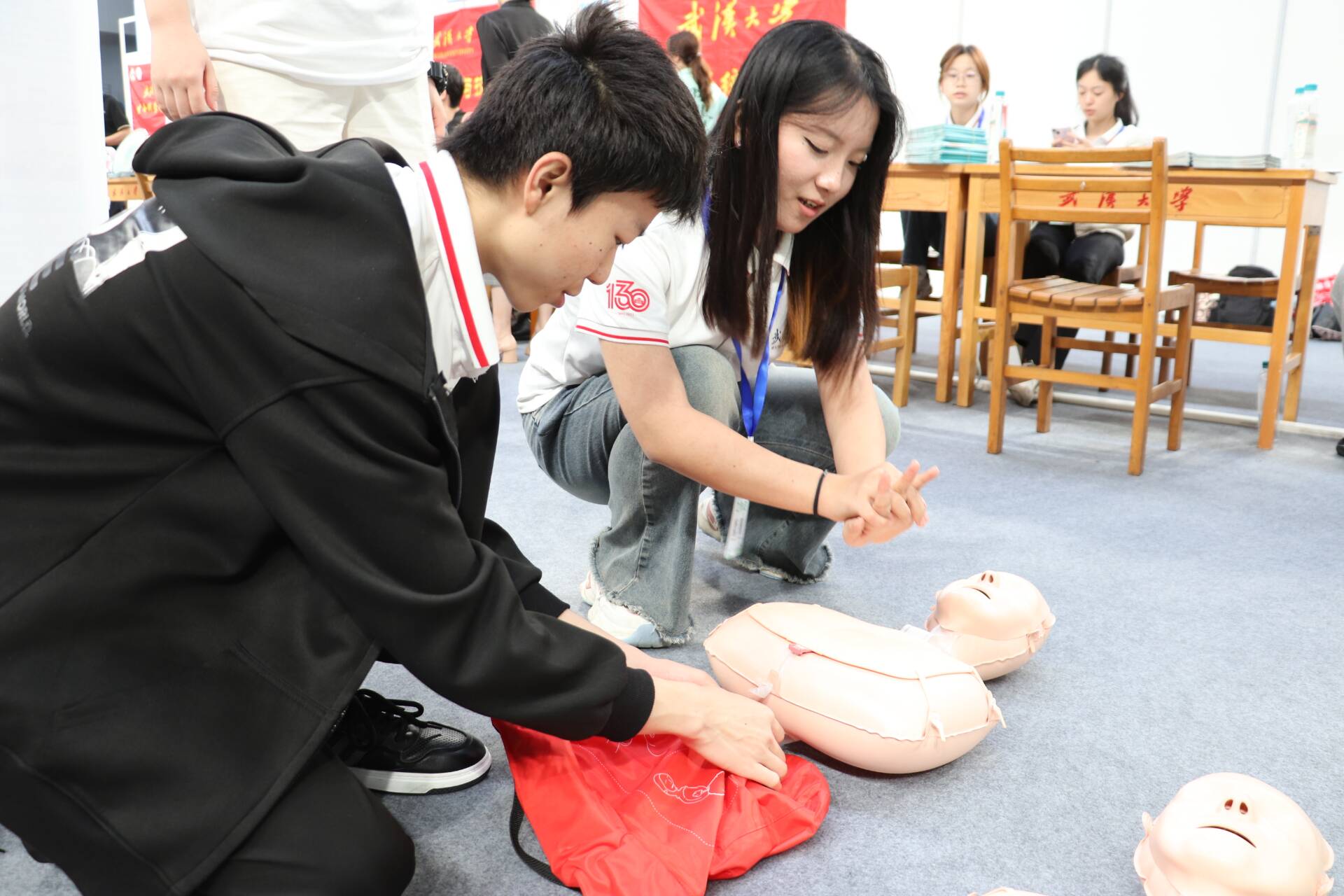 互动体验区的心肺复苏(CPR)实践教学成为一大亮点。志愿者们以专业的素养,利用人体模型,对 CPR 操作流程进行了细致入微的讲解,从判断患者意识与呼吸状况,到胸外按压的标准位置、力度把控,再到人工呼吸的规范操作,每个环节都进行了详细说明。在志愿者的指导下,现场观众踊跃参与实践操作,亲身体验急救技能的专业性与重要性,通过沉浸式学习,进一步感受到护理专业的实践魅力与社会价值。