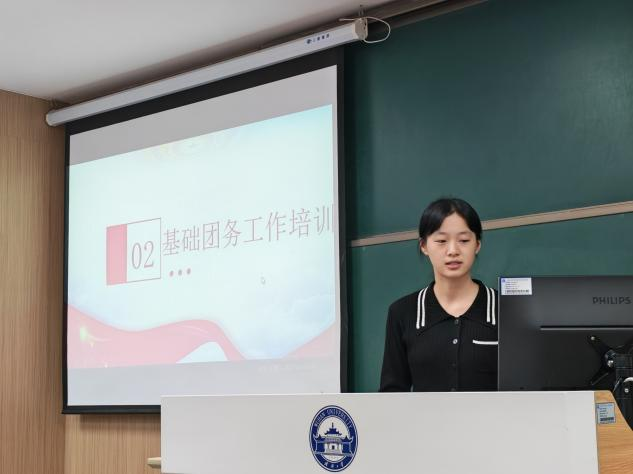 17c 学生团委副书记沈心对同学们进行了基础团务工作培训,为新生团员详细讲解了“三会两制一课”、团组织关系转接、团内激励、团支部“对标定级”工作等内容,引导同学们对团员的基本权利和义务、团的组织生活制度、评优评先机制等建立基本认知。通过培训,同学们清晰知晓了团员的责任与权益,强化了对共青团员时代使命的认同,进一步增强了组织归属感与纪律意识。