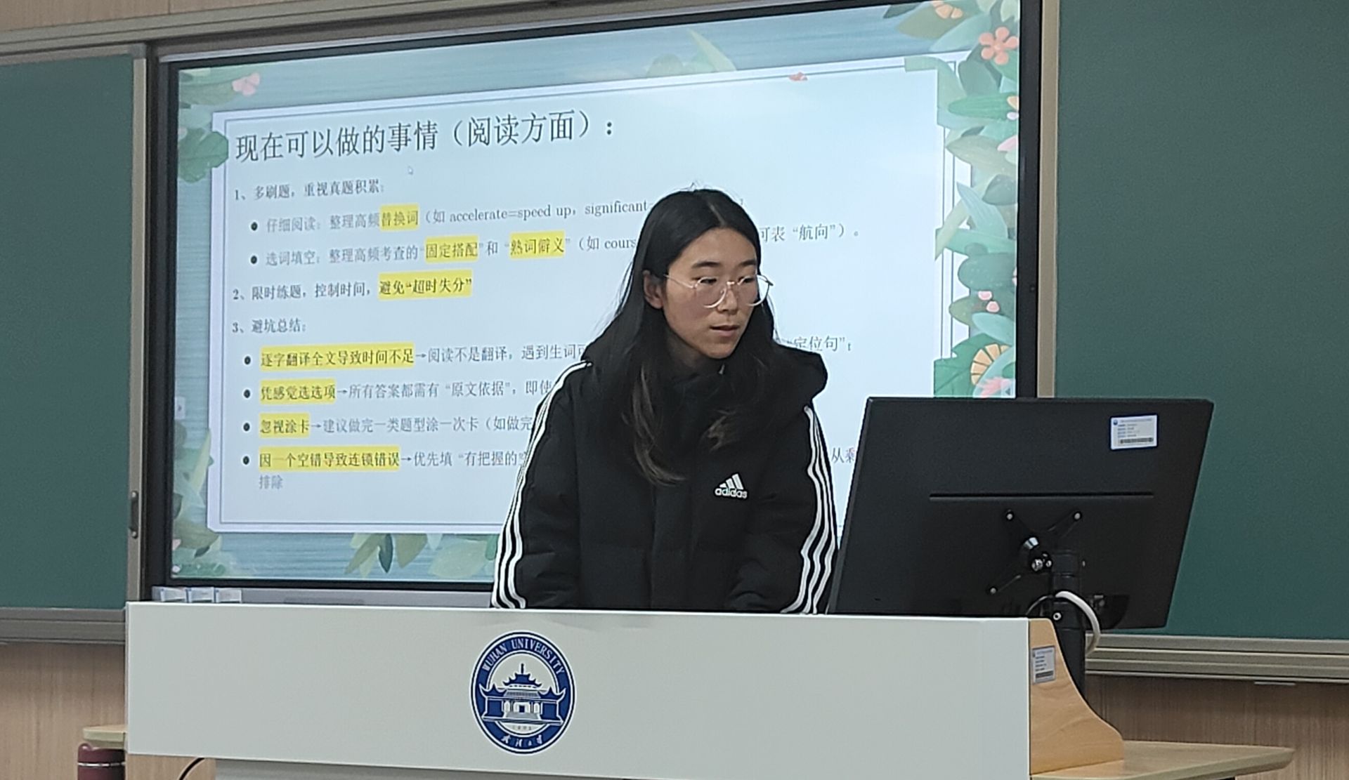 随后,周星月学姐聚焦四六级作文、听力、翻译三大模块,系统拆解高分秘籍。她基于海量刷题经验,结合往年真题深入剖析命题规律,精准总结出高频考点与核心题型;同时着重强调了答题过程中易被忽视的细节要点,内容专业实用,极具指导性。