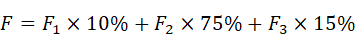 第十五条 学生素质综合测评按学年度进行计算,每年9月开展。学生素质综合测评的最终结果为基本素质测评得分、课程学习成绩测评得分、实践与创新能力测评得分的加权之和,记作F,计算公式为: