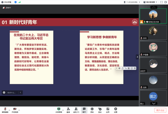 2020级全体同学于线上腾讯会议开展新学期第一次“学习新思想,做好接班人”主题班会。班主任裴先波、辅导员杜祎鑫以及2020级护理班全体同学参与会议,会议由班长汤琦主持。