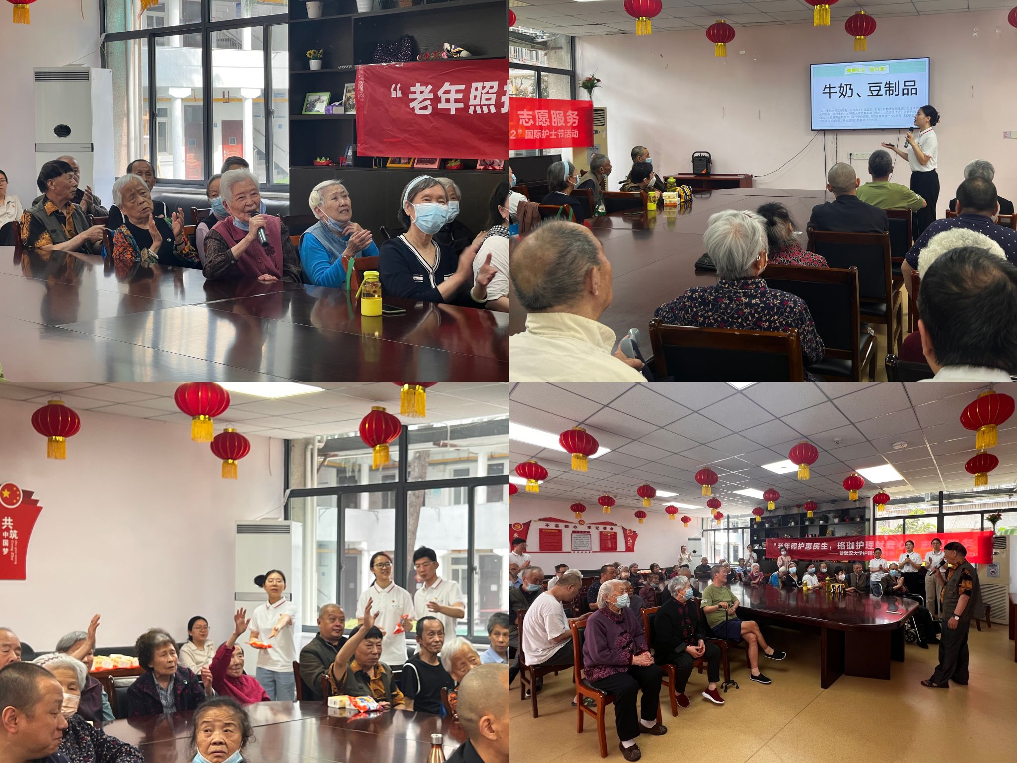紧接着,同学们轮番上阵为老人们表演经典红歌演唱、诗朗诵等节目,呈现了一场精彩的文艺表演。在同学的热情感染下,老人们也纷纷走上舞台,展示各自的才艺。在欢乐的氛围中开展了知识问答互动活动,让老人们在游戏中普及日常健康知识,提高健康意识,将活动推向了高潮。