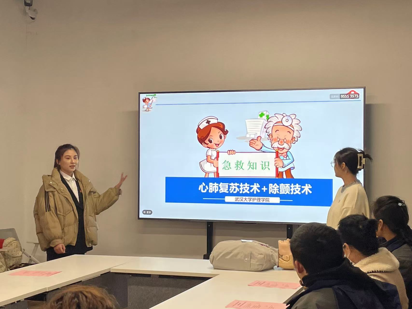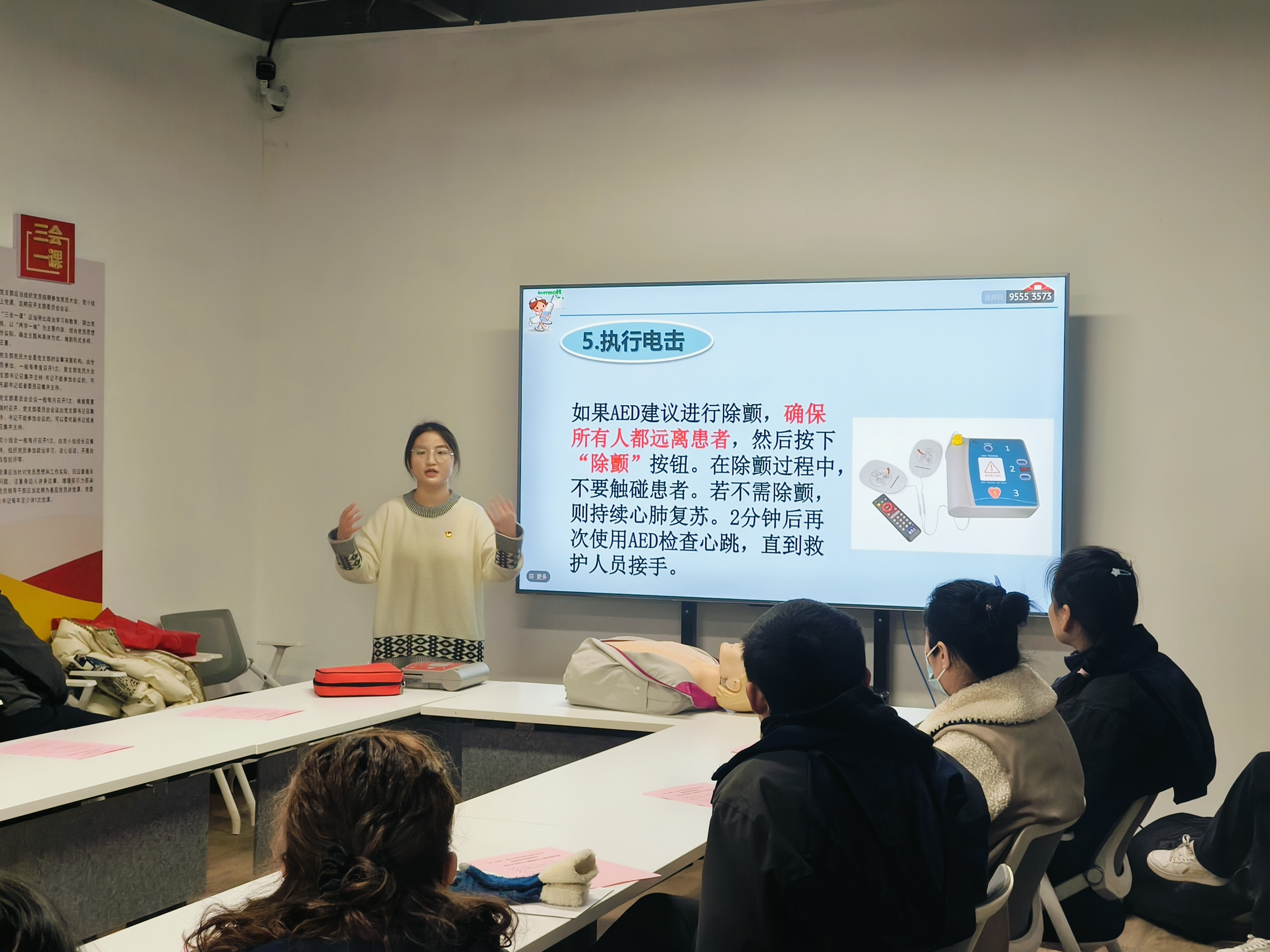 本科生党员郭静静与胡希钰作为主讲人,为学生公寓服务中心杏园项目的职工们介绍了心肺复苏(CPR)和除颤仪操作流程,并进行了现场演示和互动练习。她们从急救的“黄金4分钟”概念切入,详细阐述了心肺复苏(CPR)的每一个步骤以及AED(自动体外除颤器)的正确使用方法。培训期间,职工们积极参与到模拟操作环节,模拟处理心脏骤停、呼吸暂停等紧急情况,切实提升了应急反应能力。