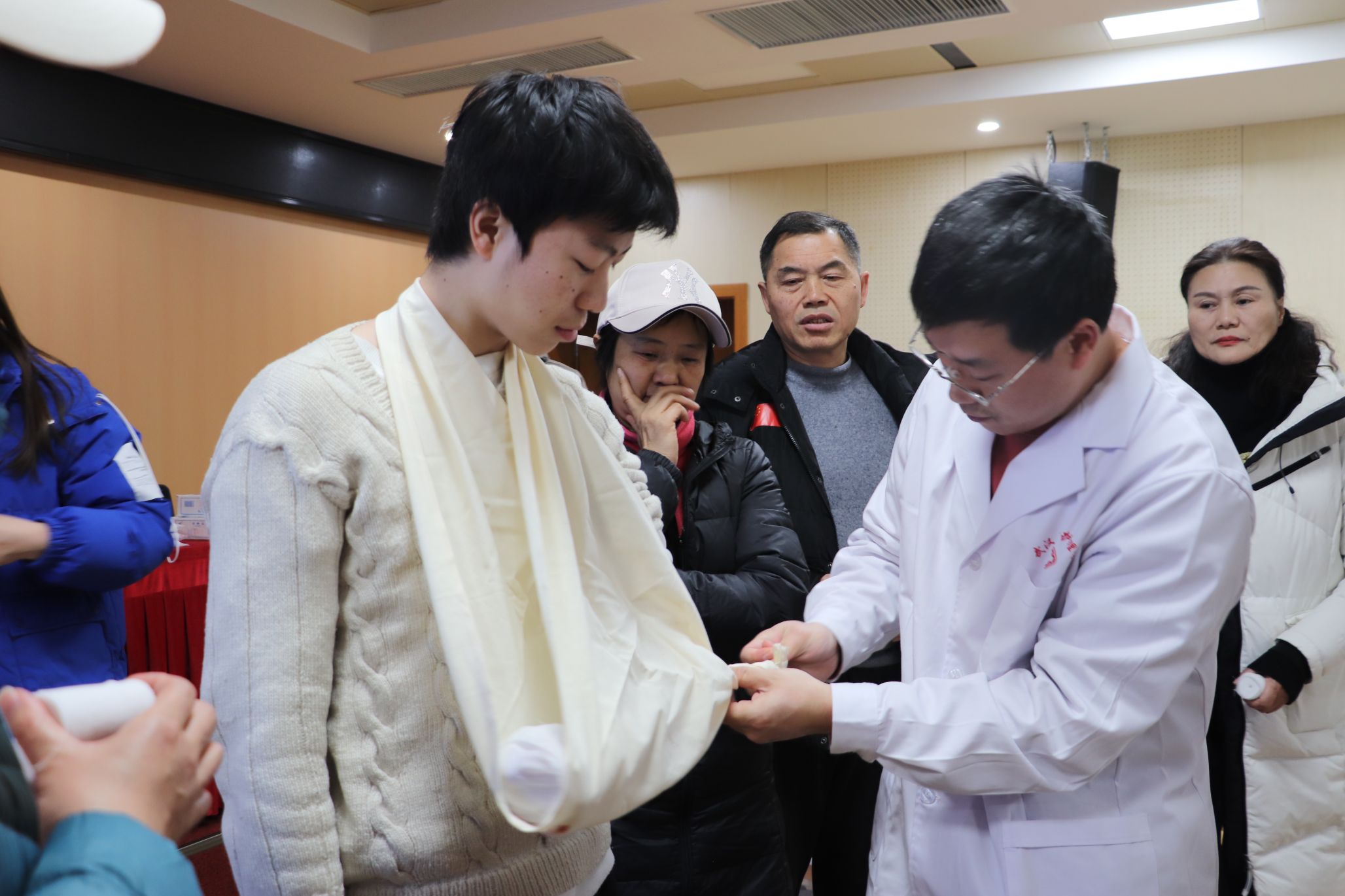 针对老师们普遍关切的包扎技能,张旭在简要介绍基本概念后,邀请了一名学生上台,详细展示了绷带包扎的全过程,进一步丰富了老师们的急救技能库。