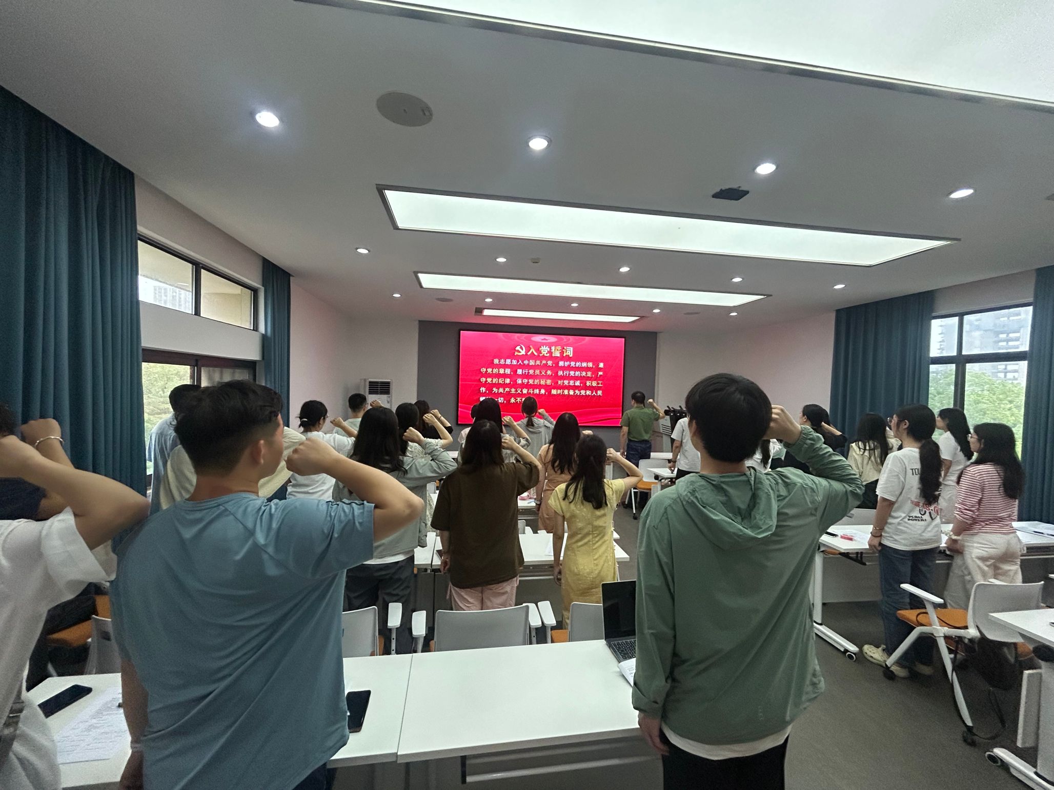 党委副书记罗睿,专职组织员张思,党建辅导员、学生第三党支部书记毛诗柔及全体毕业生党员齐聚一堂,通过重温誓词、分享交流、专题党课等形式,上好了毕业前的“最后一堂党性教育课”。