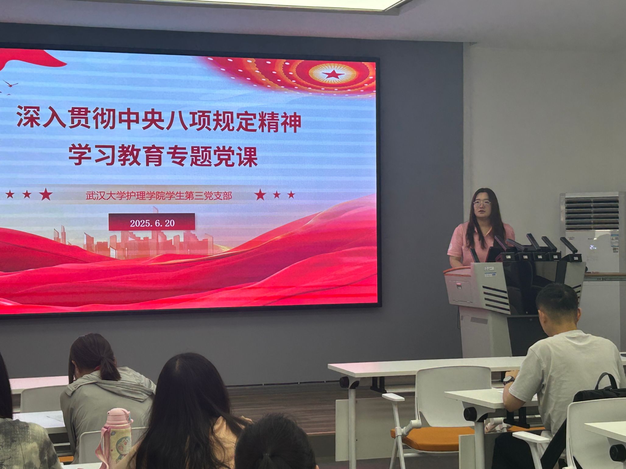 毛诗柔以"深入贯彻中央八项规定精神"为主题讲授专题党课,结合典型案例剖析新时代纪律要求,强调毕业生党员要始终保持清醒头脑,在职业道路上坚守廉洁底线,将纪律规矩转化为自觉行动,以优良作风展现党员形象。