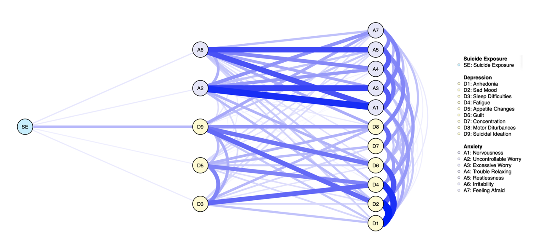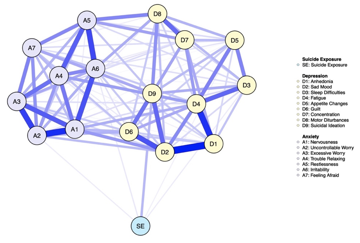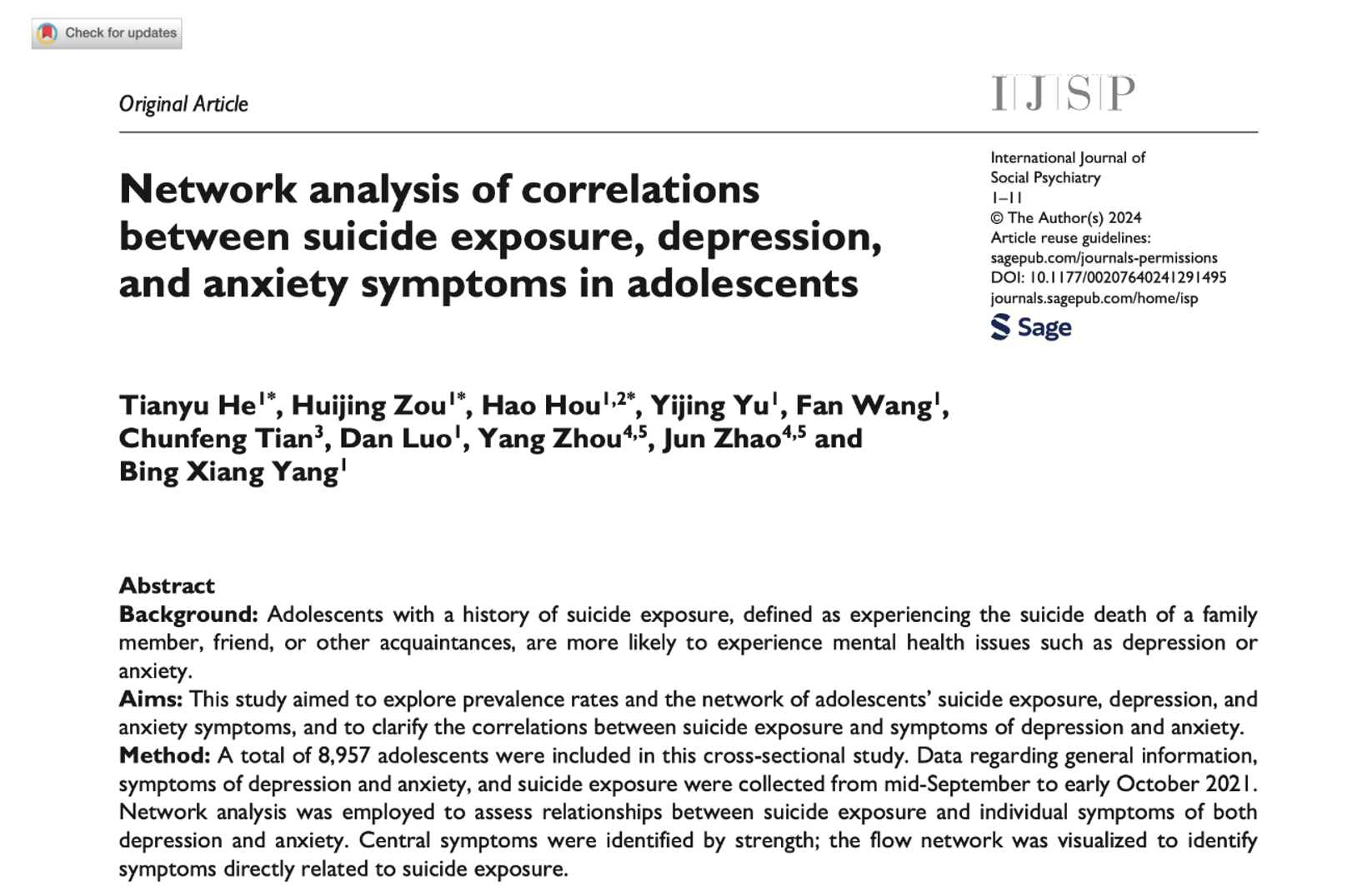 该研究旨在探讨青少年自杀暴露、抑郁和焦虑症状的流行率及其网络结构,并探索自杀暴露与抑郁和焦虑症状之间的相关性。研究指出,经历过家庭成员、朋友或其他熟人的自杀事件(定义为自杀暴露)的青少年更易出现抑郁和焦虑等心理健康问题。