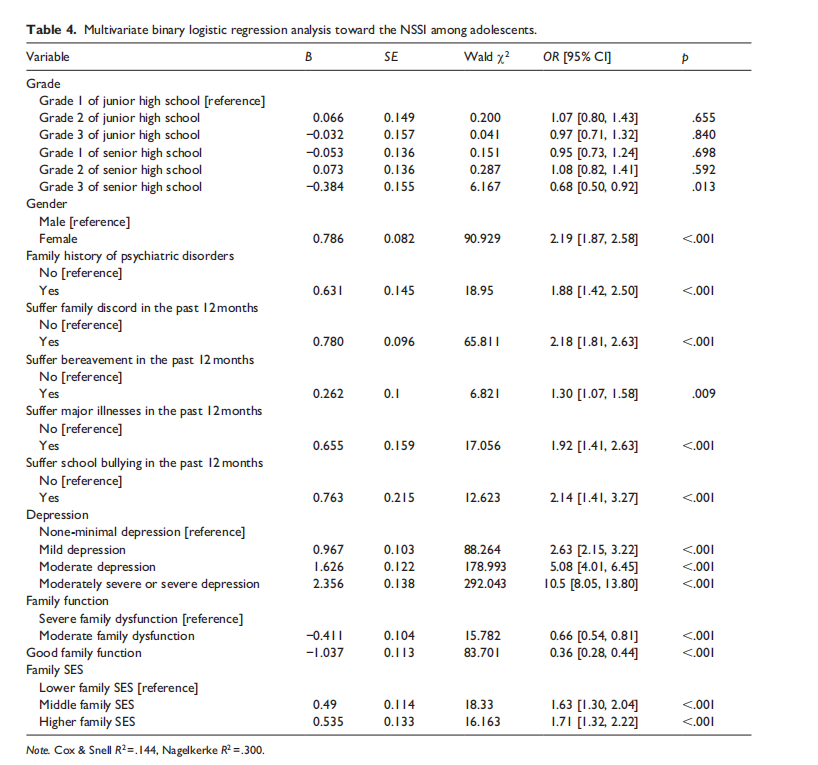 该研究分析了8872对青少年与照顾者的调查结果,描述了青少年的自伤行为现状及其客观家庭社会经济地位特征,探讨了家庭功能、家庭社会经济地位与青少年非自杀性自伤行为的关联,并分析不同家庭社会经济地位的青少年中家庭功能对非自杀自伤行为的影响。研究发现,参与调查的中国青少年中非自杀性自伤(NSSI)的发生率为10.2%。研究显示,青少年的家庭功能较差和高家庭社会经济地位(SES)与NSSI的发生存在正相关关系。